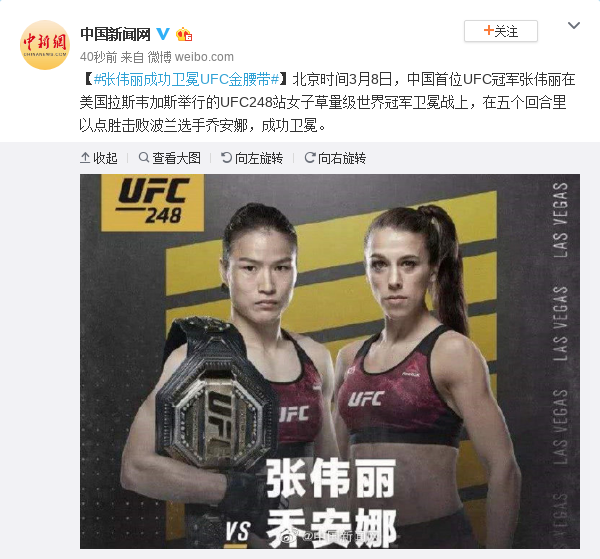 张伟丽击败波兰选手 成功卫冕UFC金腰带